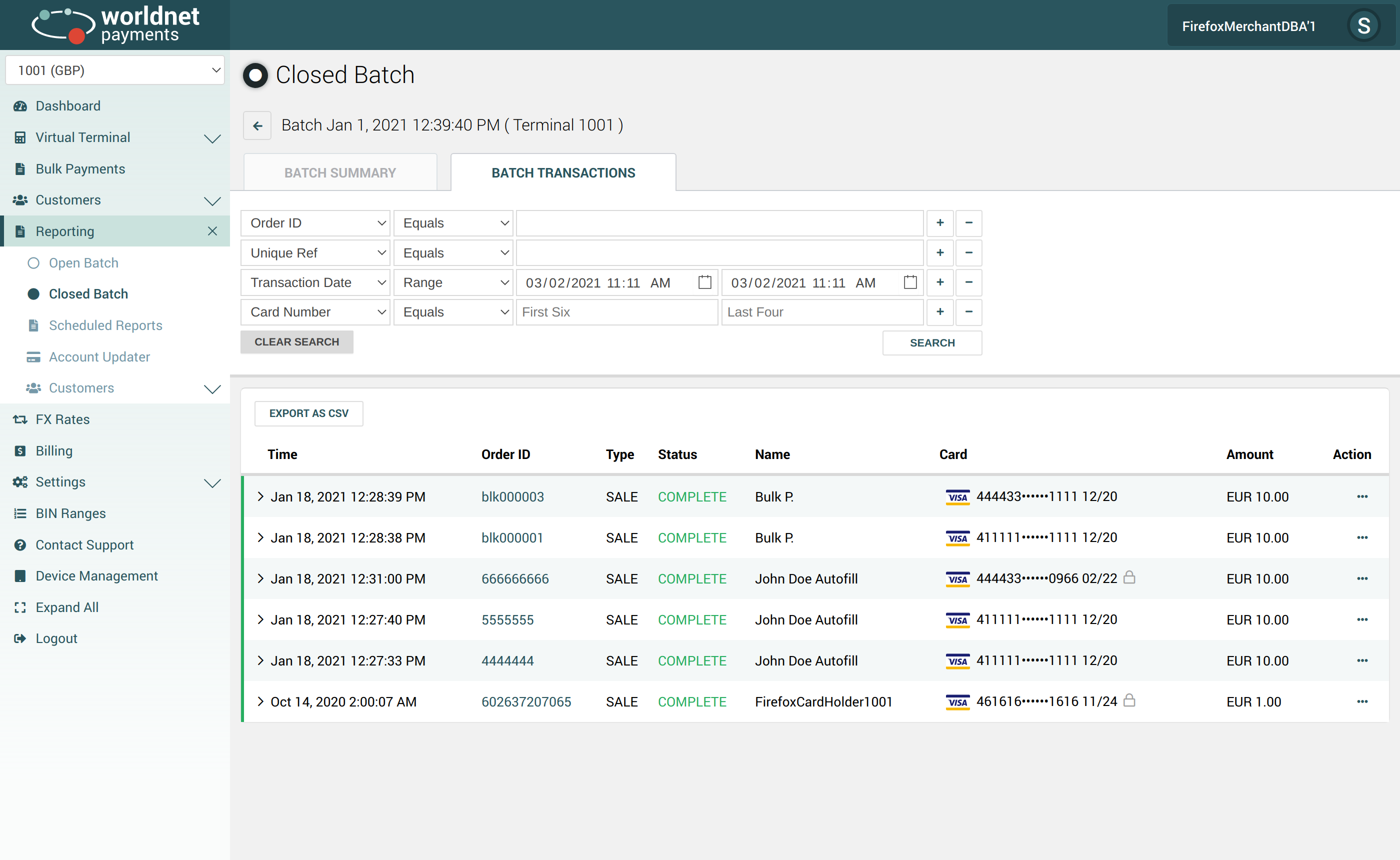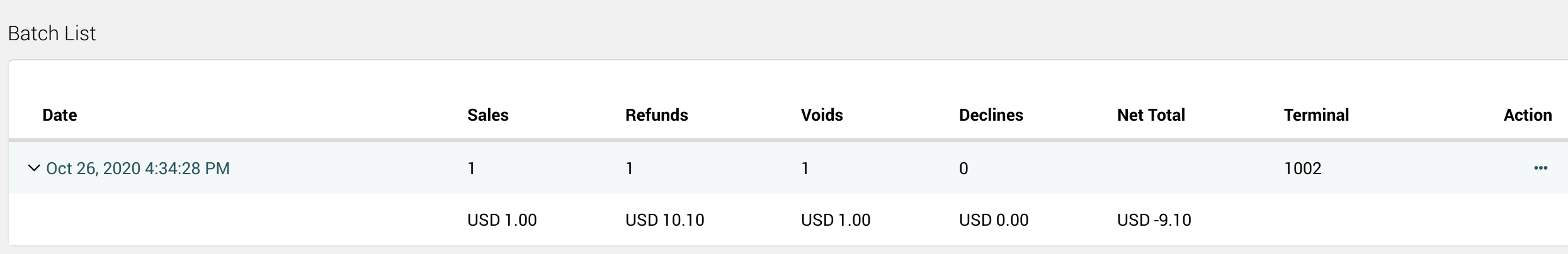 After performing a transaction, the transaction will appear in Open Batch. After settlement, the transaction is moved to Closed Batch and grouped by settlement date.