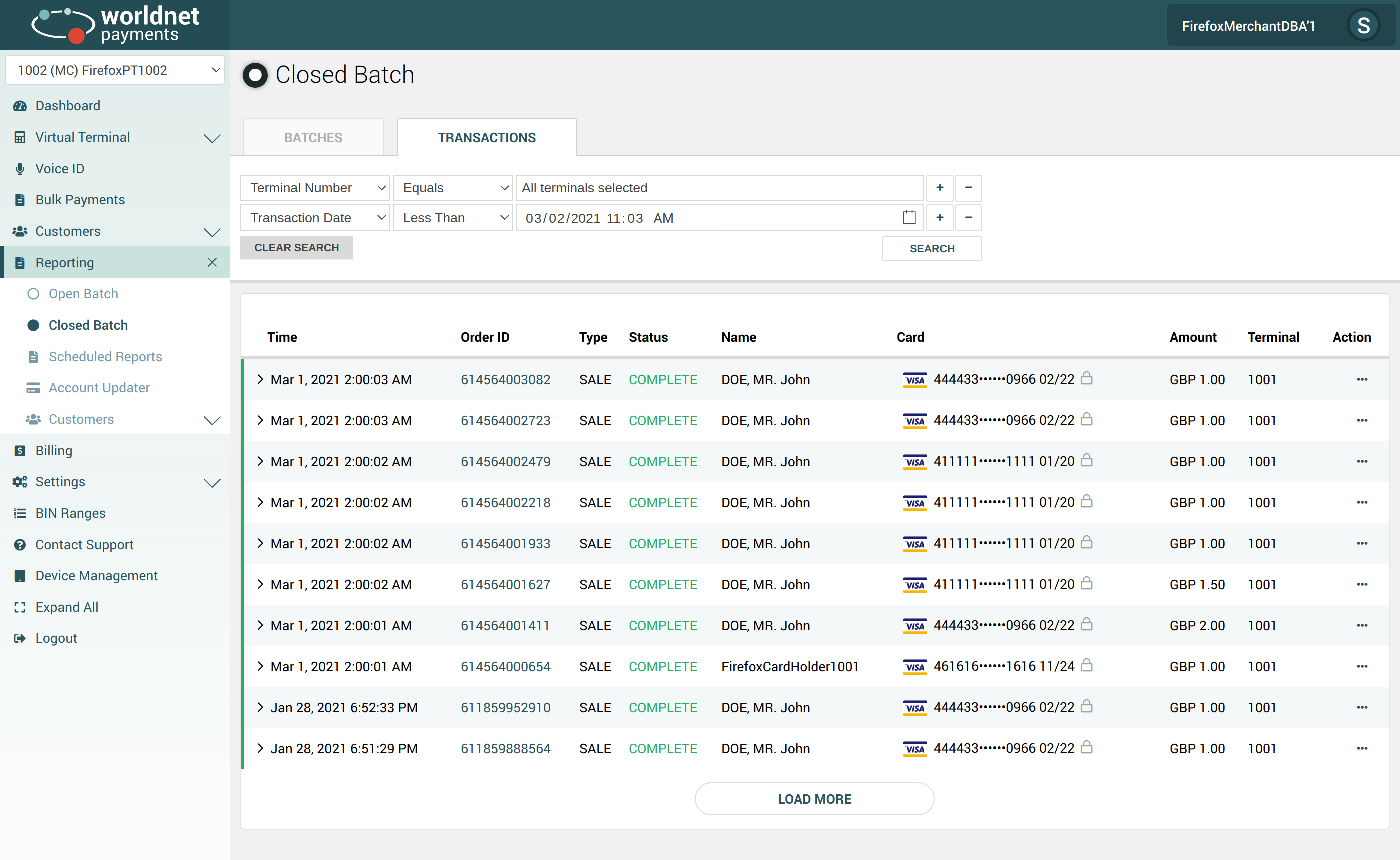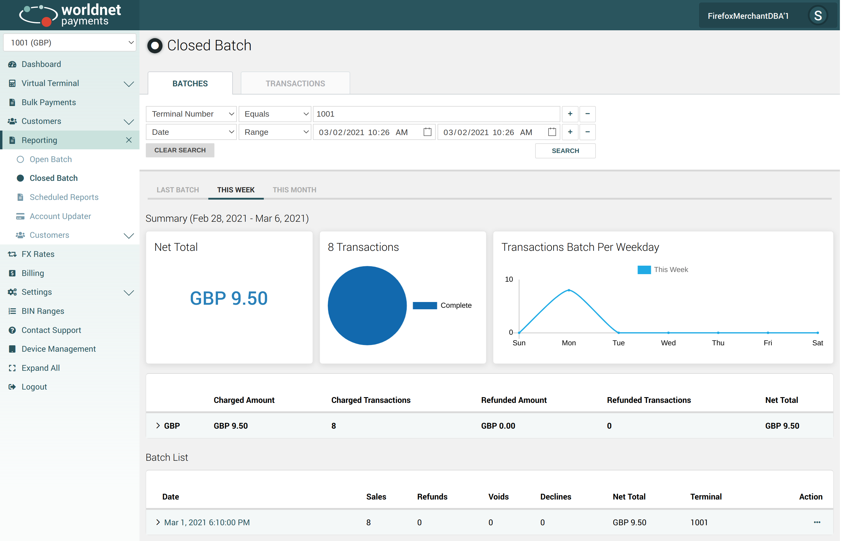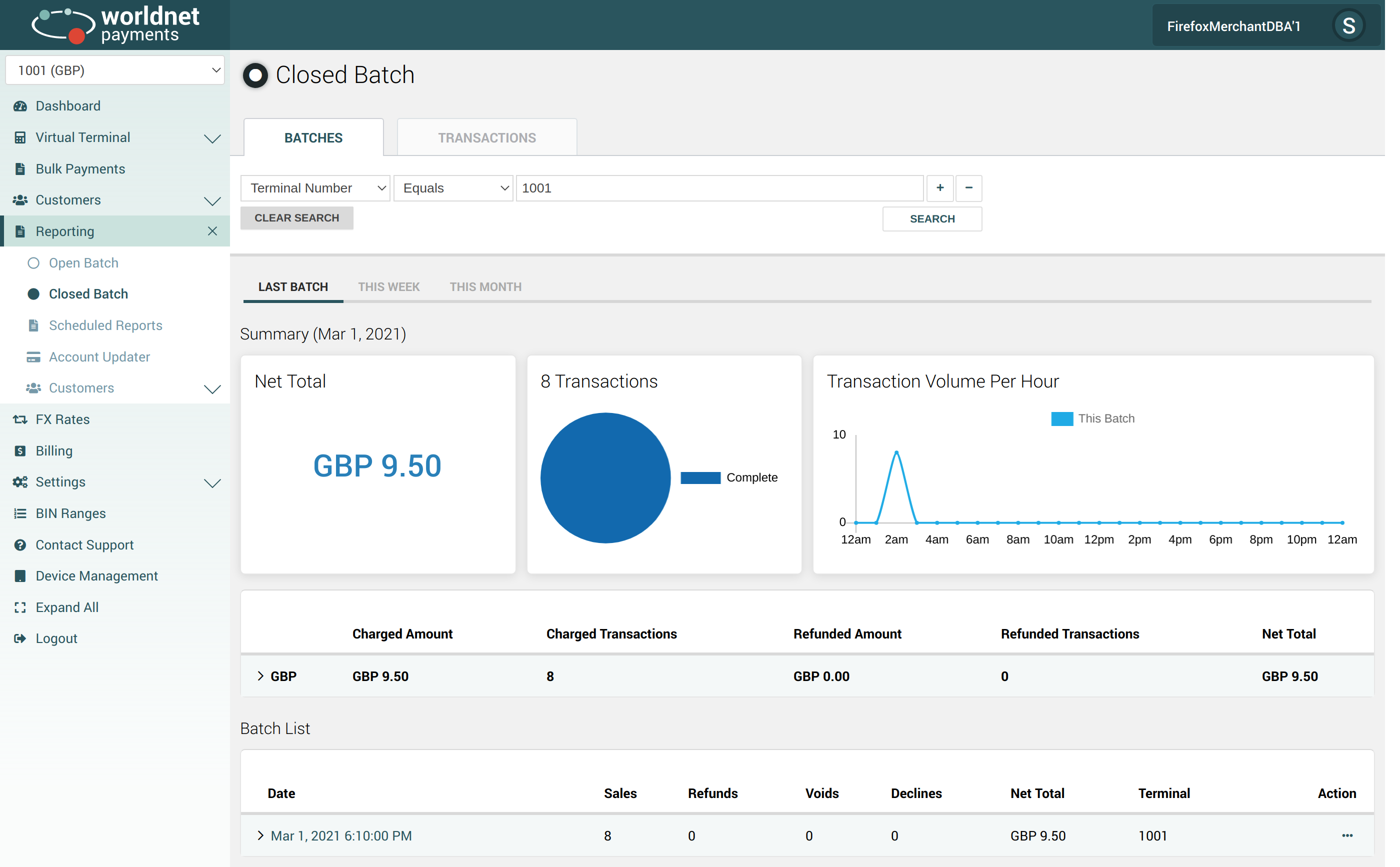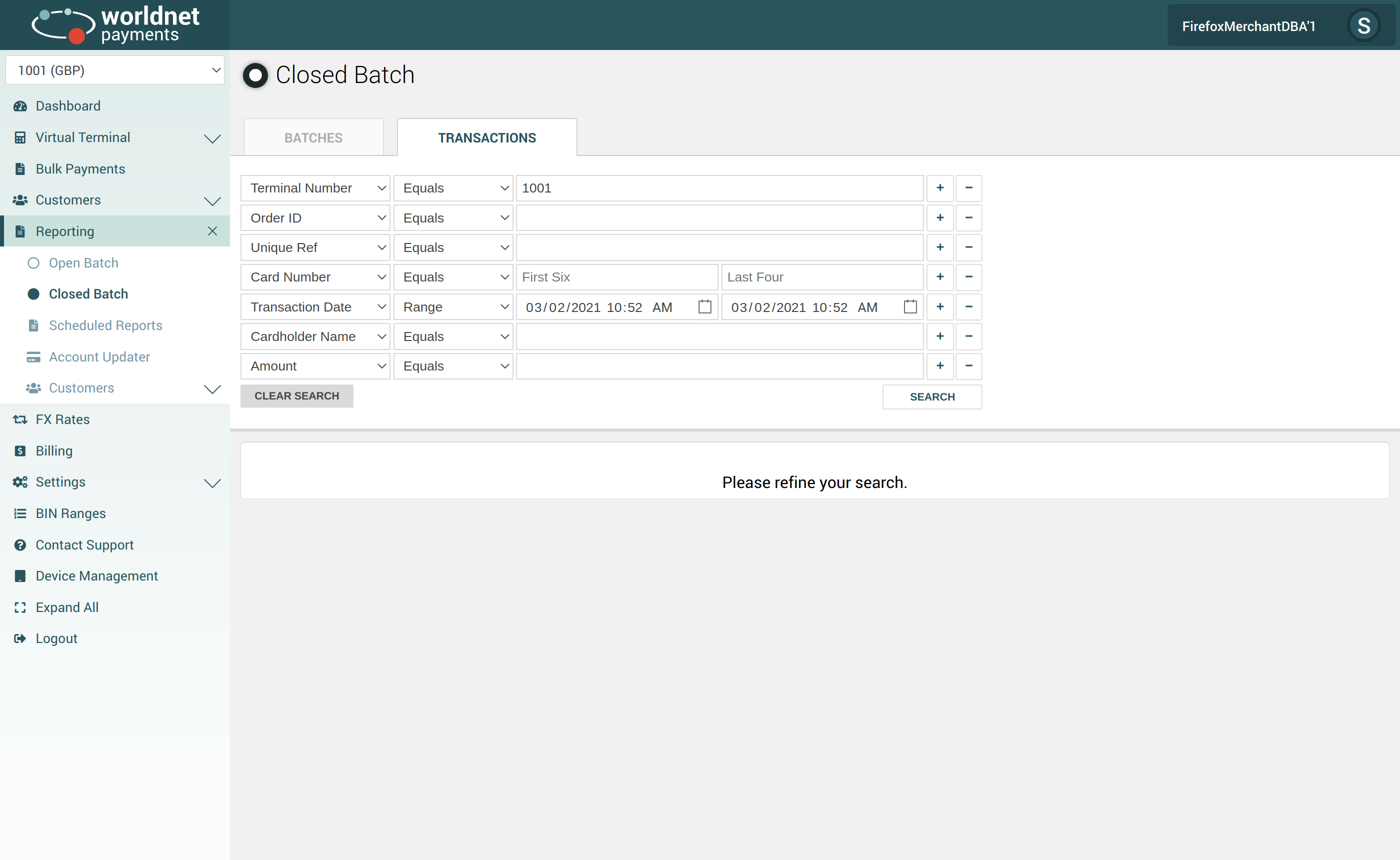 • View closed batches by date on a single terminal or on all merchant’s terminals that the user has access.