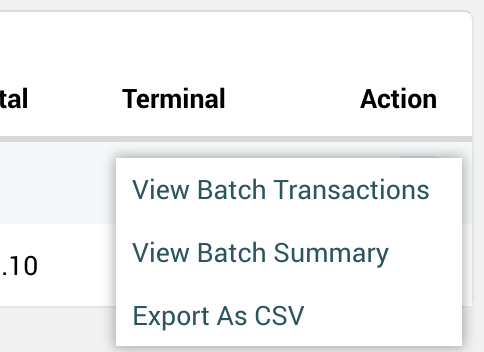 Below the currency breakdown, we find the Batch List of the period range selected (Last Batch, This Week, This Month). This is a list of all batches included in that period range. Clicking on the date will show all transactions included in that particular batch. On the right side, an action menu will appear when the user clicks on the dots [∙∙∙] menu. Three different actions will be presented: