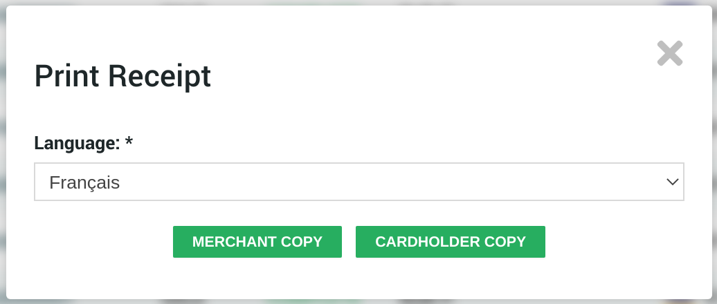 Print Receipt, this will open a panel where the user can select different languages (if available) and two buttons indicating if the user requires a Merchant Copy or a Cardholder Copy.