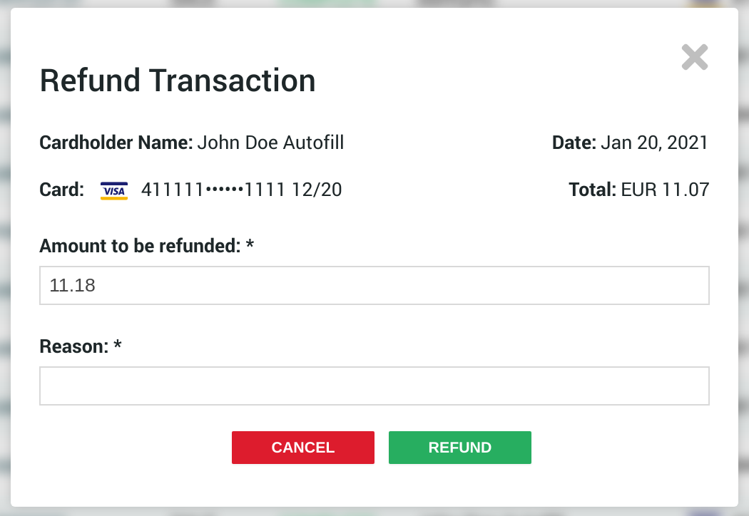 • Refund, this allows the user to perform a quick refund. The Refund Panel will display details about the transaction and will ask the user the amount and the reason for the refund to be performed.