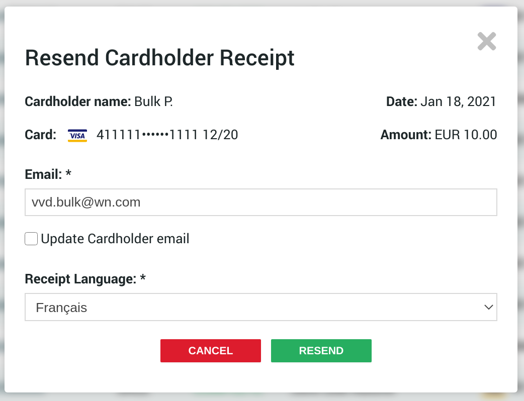 Resend Cardholder Receipt, this will open a panel with an input field asking for an E-mail address. The user can click on the Update Cardholder email checkbox to update the email address used during the transaction. Also in multi language terminals, it will ask for a Receipt Language.