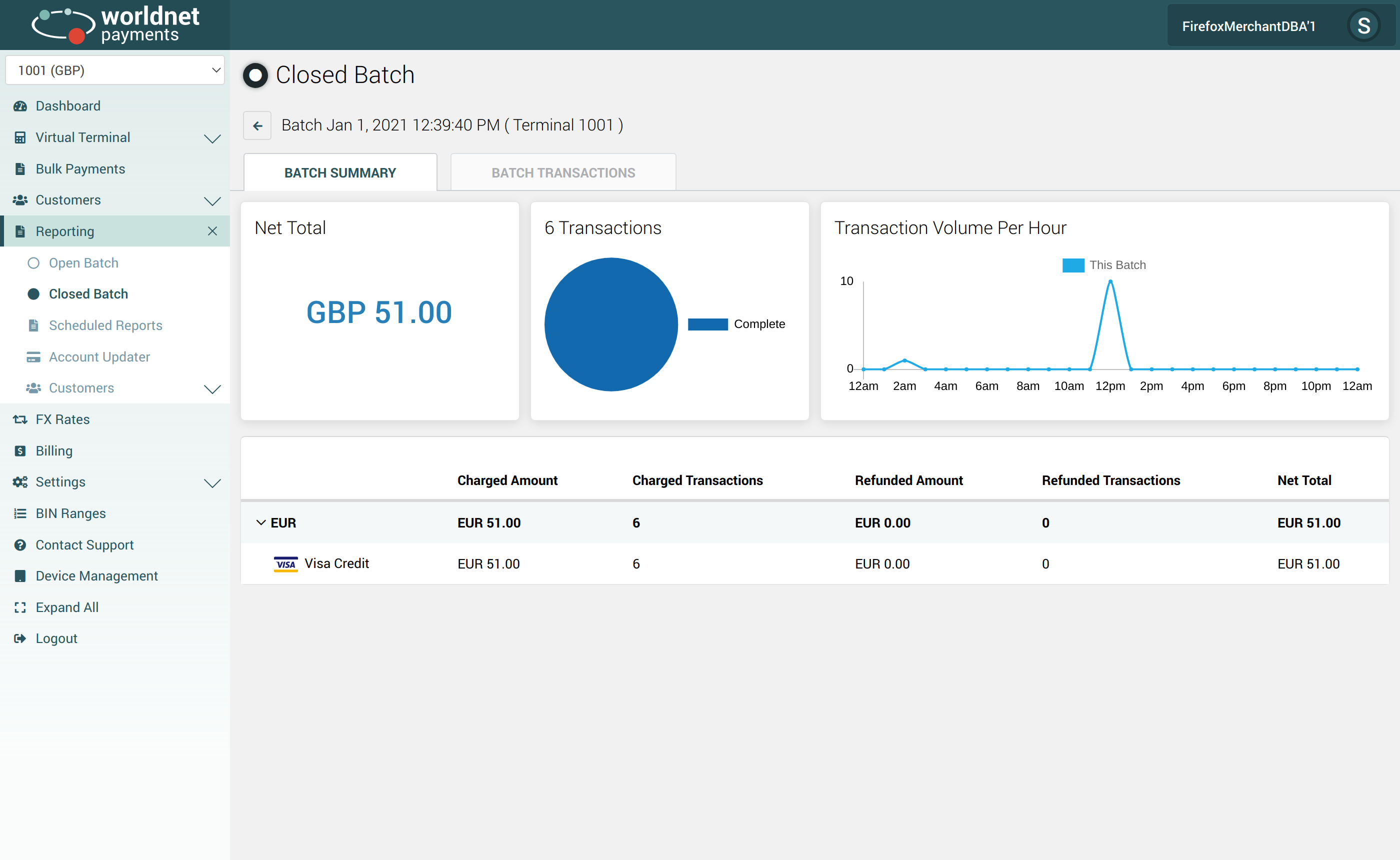 • View Batch Summary: Displays a summary of that batch with a detailed graph and a breakdown of transactions divided by currency.