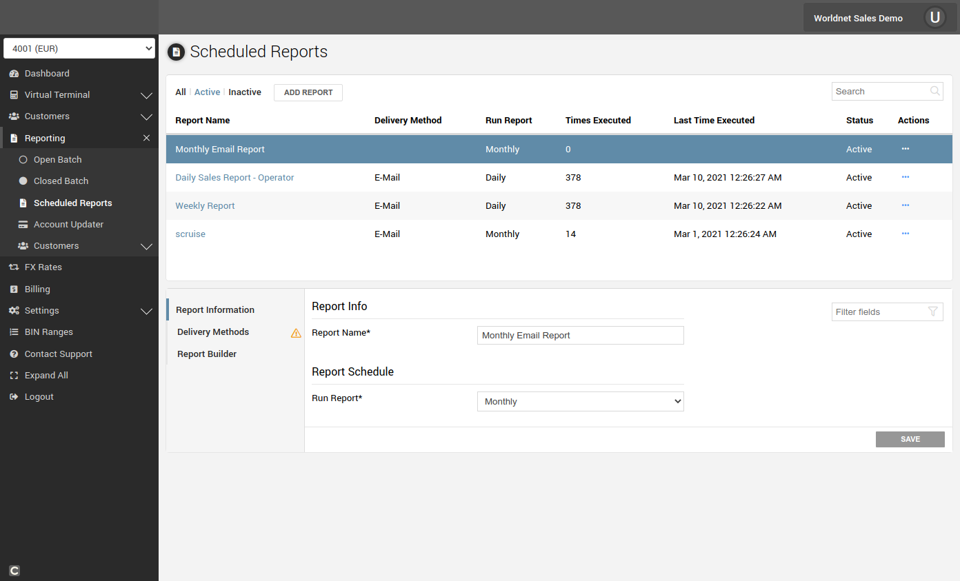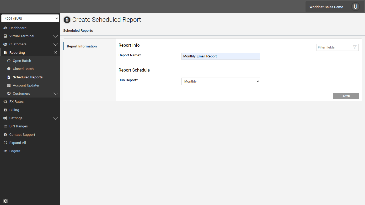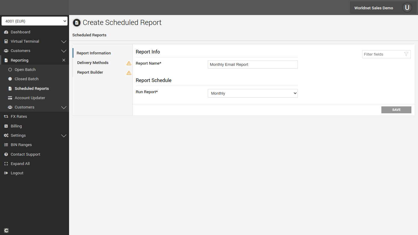 If the Scheduled Report is not available in your terminal, please e-mail support@worldnettps.com to activate the feature.