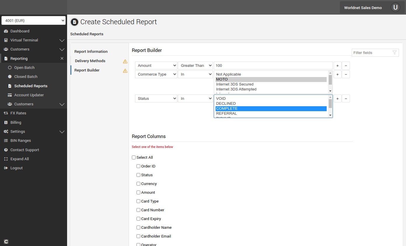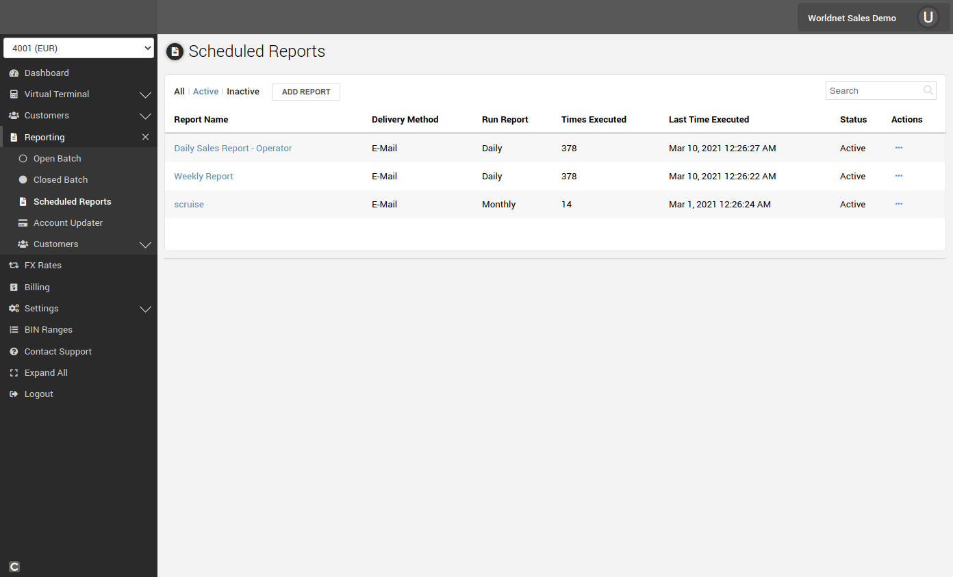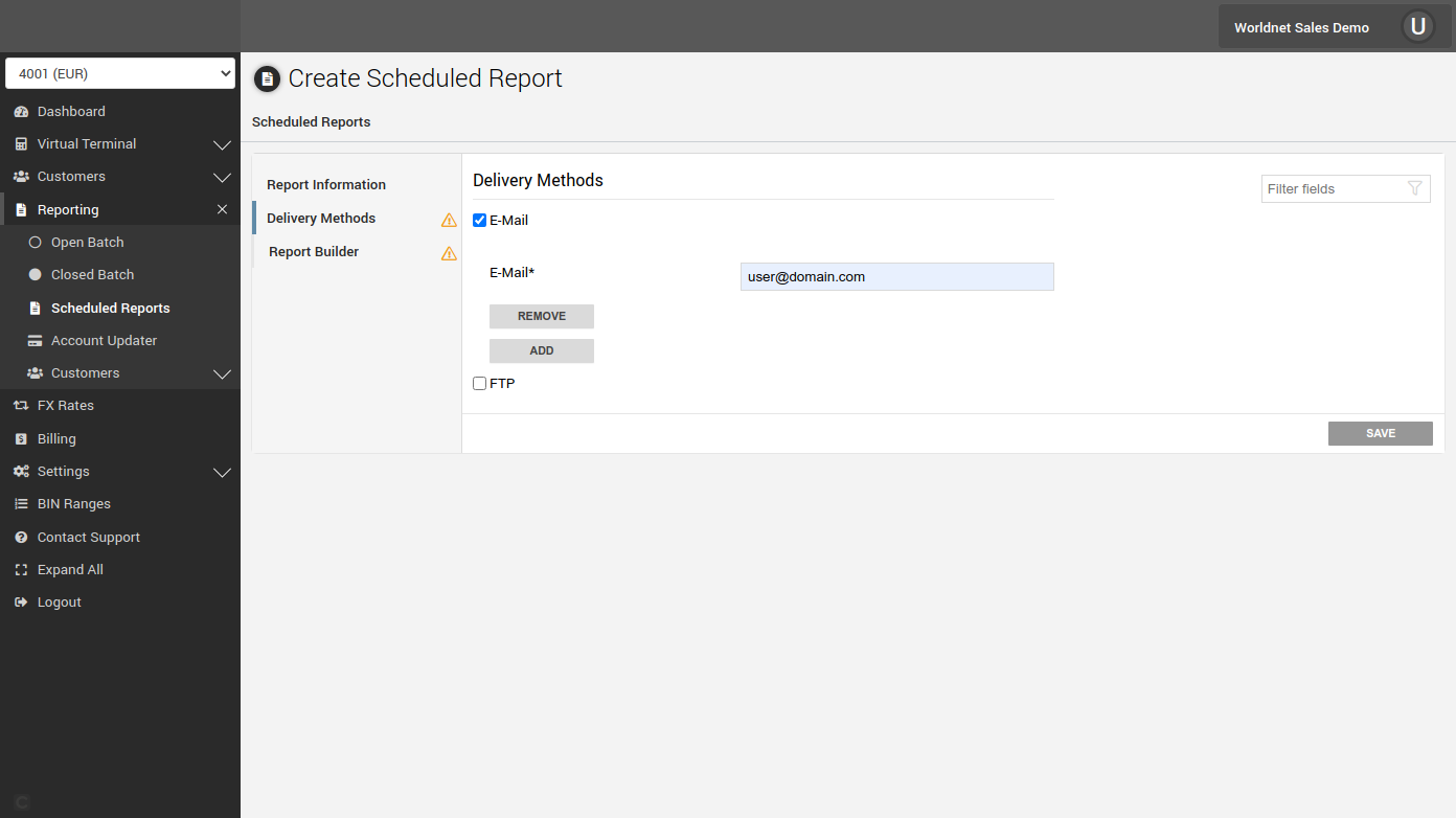 If the Scheduled Report is not available in your terminal, please e-mail support@worldnettps.com to activate the feature.