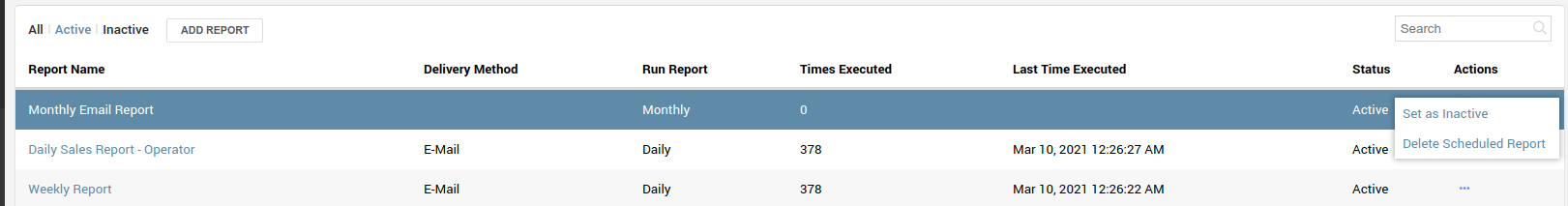 On the Scheduled Report screen (Figure 7) there are three different tabs: All, Active and Inactive. Reports in the Active tab will show only the Schedule Reports currently running. If you created a Once Off report, after it has been delivered it will be moved to the Inactive tab.