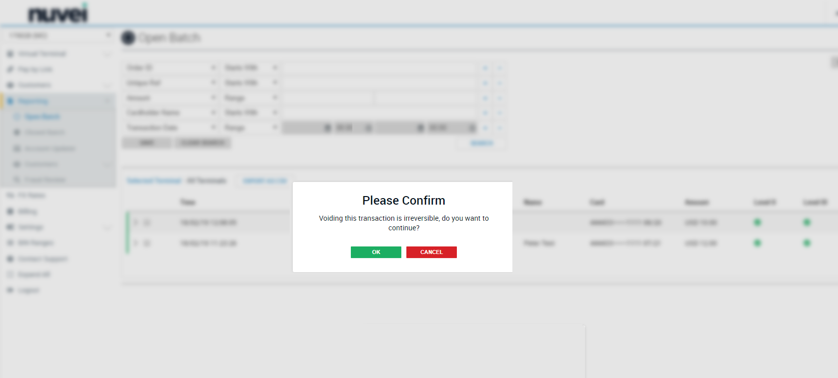 A Void is the cancellation of a previous sale that has not yet been settled/batched. A void can only be performed on transactions in the Open Batch. The original sale transaction is effectively removed from the batch of transactions to be settled, but will still appear with a status of “Void”. Once a transaction has been voided this action cannot be undone.