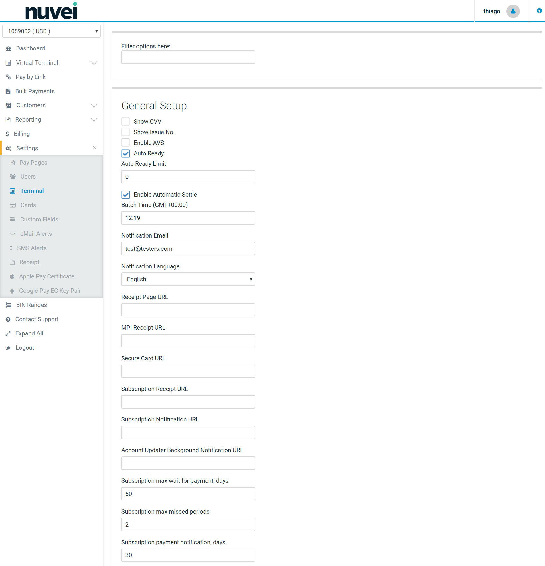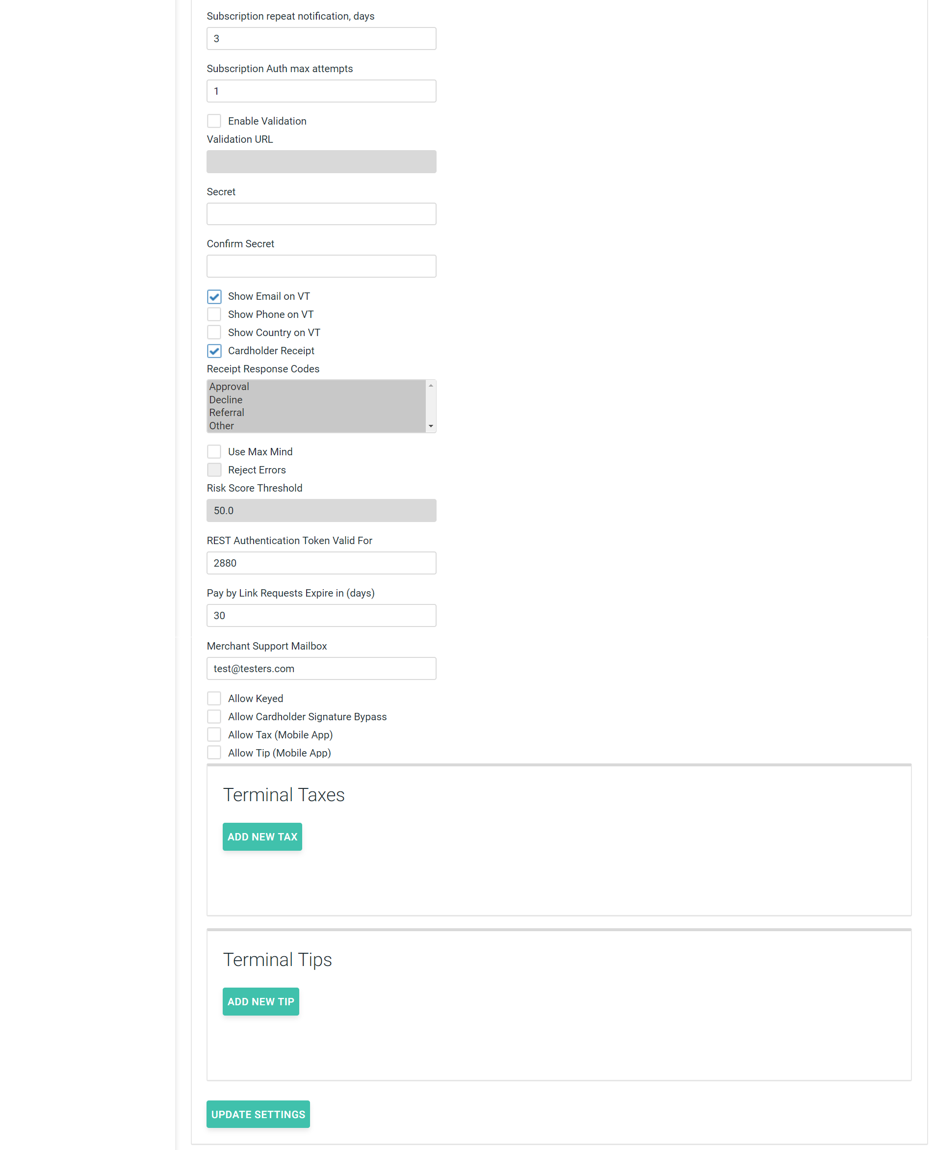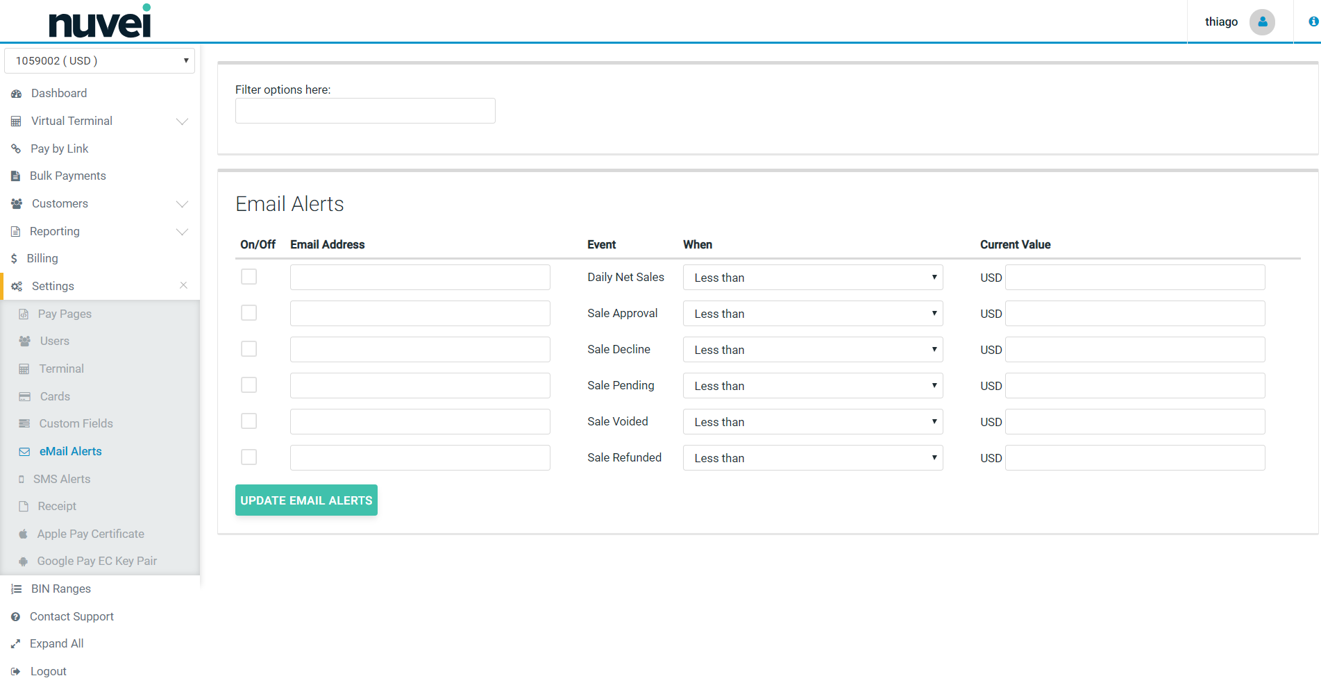 Email Alerts are a part of “Settings” menu. Alerts allow you to set email notifications for different types of transactions such as daily sales, approved and declined sale or voids and refunds. Alerts can be sent depending on individual requirements. Also different email addresses can be used for each notification. Only one email address can be used for each alert though.