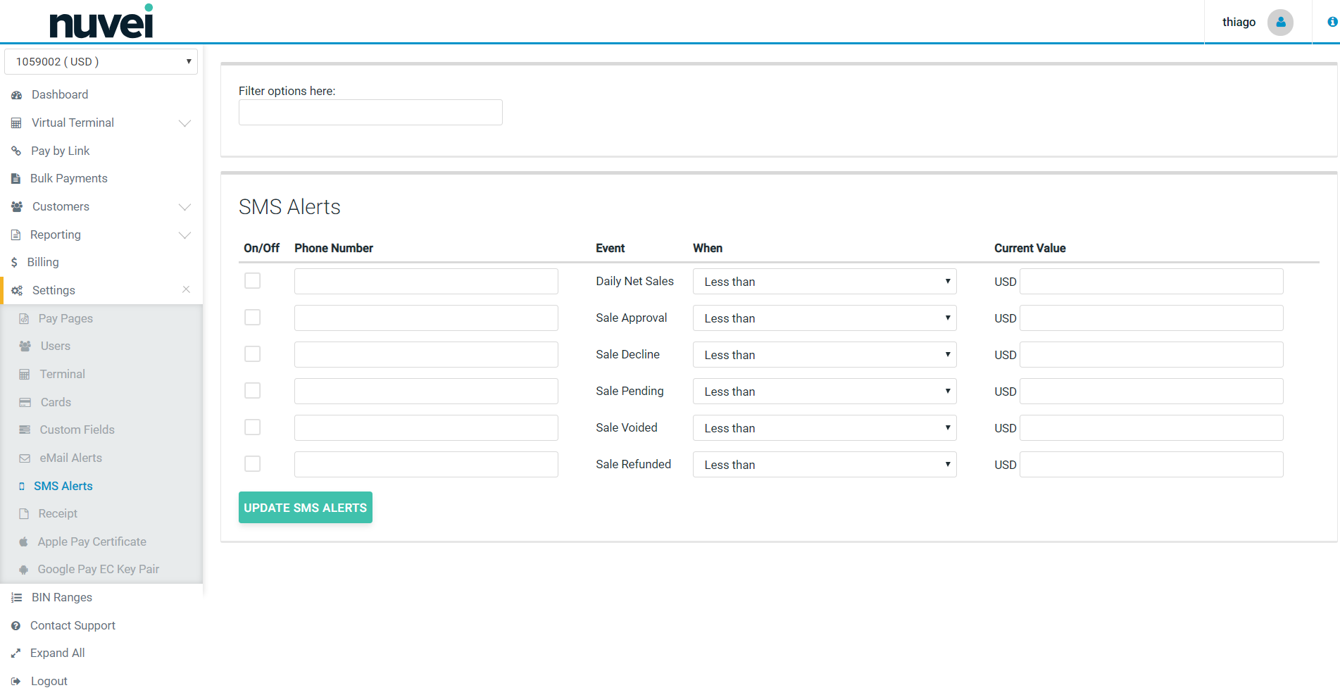 Worldnet Payments provide the ability for merchants to be notified when specific events occur in their payment processing system. You can find “SMS Alerts” section under the SETTINGS tab in the Selfcare. This notification can be in the form of an eMail, an SMS message, or both.