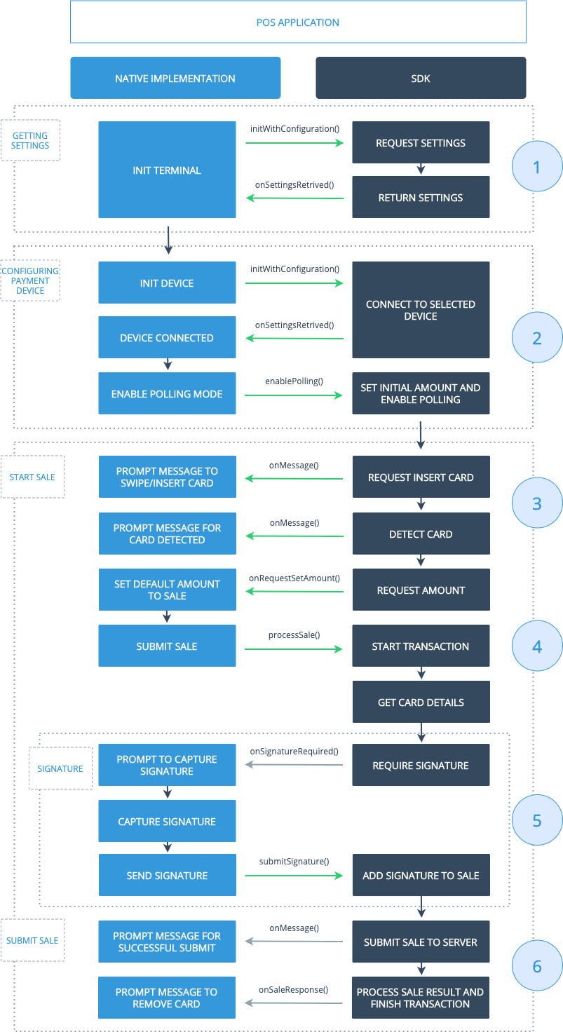 - (4) Cardholder Confirmation When the transaction method requires a signature (or PIN entry), the SDK is going to require that from your application. After your application submits the captured signature, the SDK will add it to the sale and submit it to the gateway.